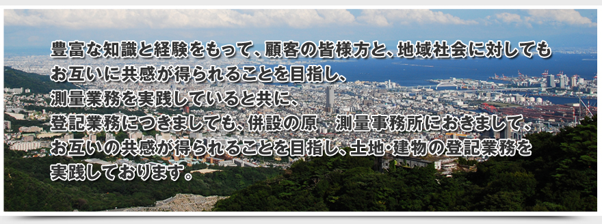 豊富な知識と経験をもって、顧客の皆様方と、地域社会に対してもお互いに共感が得られることを目指し、測量業務を実践していると共に、登記業務につきましても、併設の原 測量事務所におきまして、